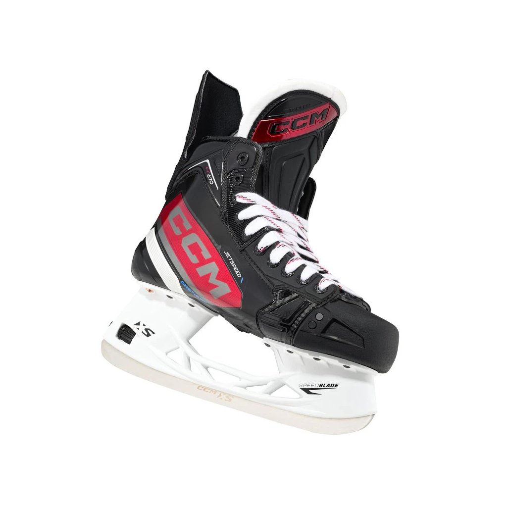 Brusle CCM JS FT670 z nejnovější generace bruslí CCM JETSPEED v atraktivním černo-červeném designu určená pro rekreační a hobby hráče s frekvencí hraní 2-3 týdně. Komfortní brusle se vstřikovaným kompozitovým skeletem a se špičkovým novým holderem SPEED BLADE SB XS. Bota má díky technologii One Piece Boot a kvalitnímu syntetickému kompozitu vysokou torzní tuhost. Vnitřní materiál je vysoce odolné HD mikrovlákno s otěruvzdorným vyztužením Durazone. Pro dosažení maximálního komfortu je tato brusle plně tepelně tvarovatelná. Tuto službu Vám při zakoupení bruslí nabízíme zcela zdarma. Nahřívání a tvarování bruslí je možné pouze při osobním odběru na naší prodejně v Olomouci. Jazyk brusle je inovovaný a je vyroben z filcu s lisovanou ochranou proti zařezávání tkaniček do nártu nohy. Jazyk je díky systému XS Tonque velmi snadno vyměnitelný. Plsť o tloušťce 7mm se zpevňujícími vrstvami pro vylepšené pohodlí a ochranu. Podrážka boty je rovněž vstřikovaná s důmyslným systémem odvětrávání. Napomáhá dokonalému přenosu energie při každém záběru. Stélka boty brusle CCM Ortholite je anatomicky tvarovatelná. Poskytuje oporu a pohodlí při hře. Jsou použity plastové holdery SPEEDBLADE SB XS, což jsou nové holdery z dílny značky CCM, kde lze velmi rychle vyměnit nůž bez použití nářadí. Tento holder umožňuje větší záběr i stabilitu při zatáčení. Nože jsou vyrobeny z nerezové oceli SB XS Stainless Steel. Tyto brusle se vyrábí ve dvou šířkách a to Regular (R), která odpovídá běžné šířce chodidla a dřívějšímu značení D a Wide (W), kerá odpovídá dřívějšímu označení EE a je určena pro širší chodidlo. Brusle jsou dodávány nenabroušené, v případě zájmu Vám je můžeme dodat nabroušené na naší profesionální brusle Pro Sharp AS2001. Broušení objednáte jednoduše vložením položky Broušení bruslí v Olomouci - Hockeyland do nákupního košíku.