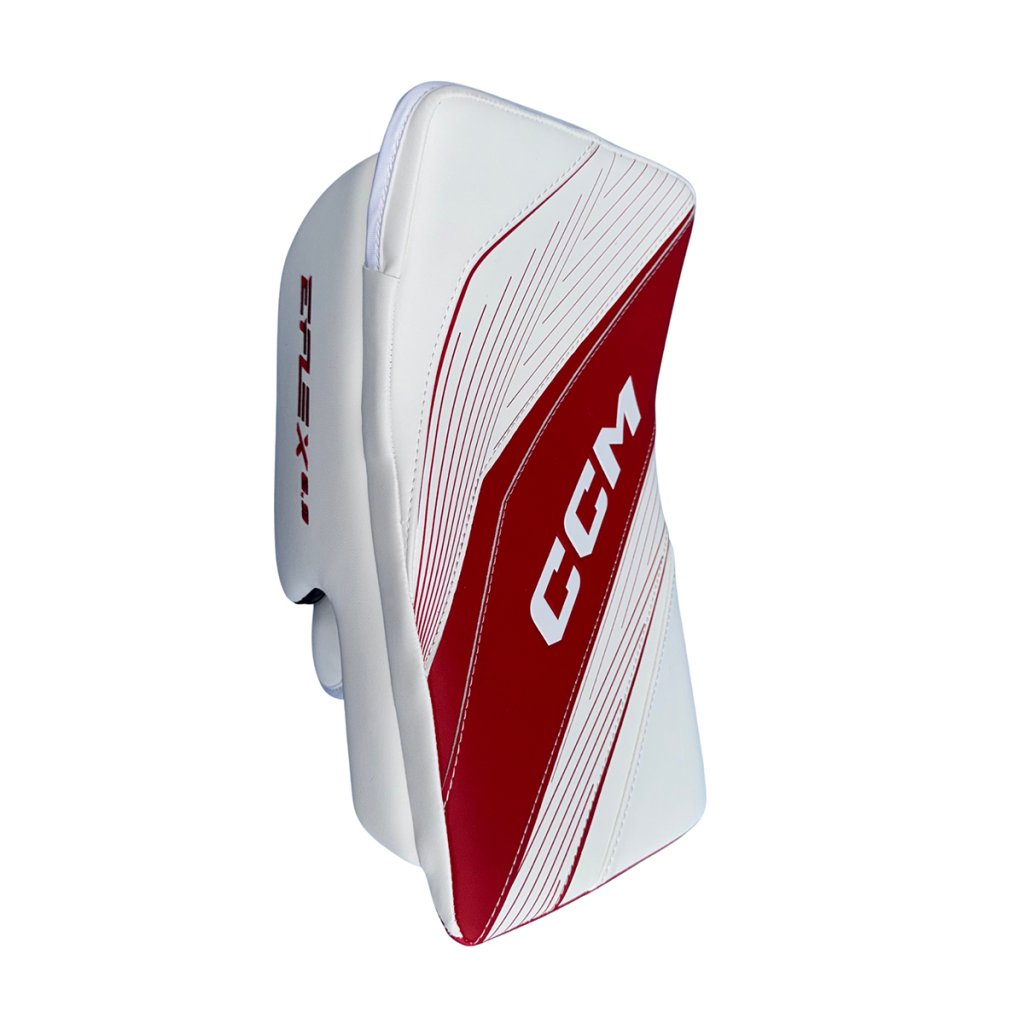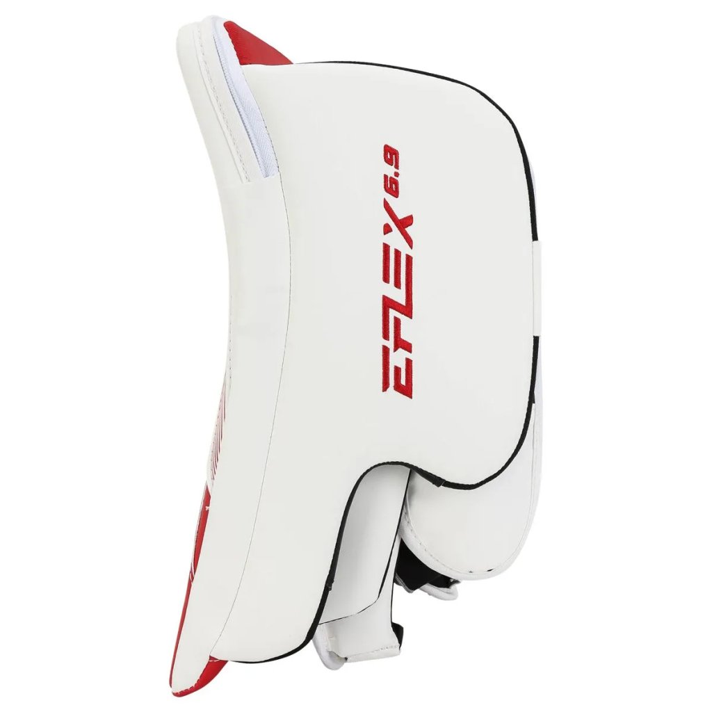 VYRÁŽEČKA: Špičková vyrážečka z modelové řady CCM Eflex 6.9 je druhým nejvyšším modelem z této řady. Velmi lehká vyrážečka CCM Eflex 6.9 se špičkovou úrovní ochrany, ovládání i komfortu a s dokonalým vyvážením. Vnitřní výztuž hlavní horní vyrážecí plochy vyrážečky je vyrobena laminovaným, speciálním pěnovým materiálem s dvojí hustotou a odolným PE. Jeho vlastnosti umožňují brankáři cíleně a přesně ovládat odrazy puku a přitom zajišťuje profesionální úroveň ochrany i před nejprudšími střelami. Jako vnější materiál je použit špičkový materiál s technologií Speed Skin. Špičková boční ochrana vyrážečky je zajištěna díky vstřikované a anatomicky tvarované konstrukci ochrany palce, spolu s kombinací vnitřních výplňových pěnových materiálů různé hustoty. Tato promyšlená konstrukce poskytuje komplexní ochranu vnitřní boční strany vyrážečky. Otevřená manžeta umožňuje brankáři perfektní pohyblivost v zápěstí a dokonalou ovladatelnost, díky upevňovacímu pásku na zápěstí je zajištěno jisté upevnění na ruce.